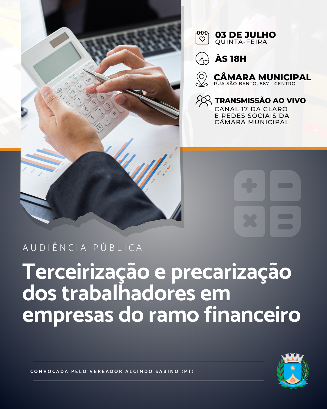 A Câmara Municipal de Araraquara convida para participar da audiência pública para debater sobre "Terceirização e Precarização dos trabalhadores e das trabalhadoras em empresas do ramo financeiro". Requerida pelo vereador Alcindo Sabinoo (PT) — requerimento nº 915/2025 —, a audiência será transmitida ao vivo pela TV Câmara (canal 17 da Claro), pelo Facebook e pelo YouTube.