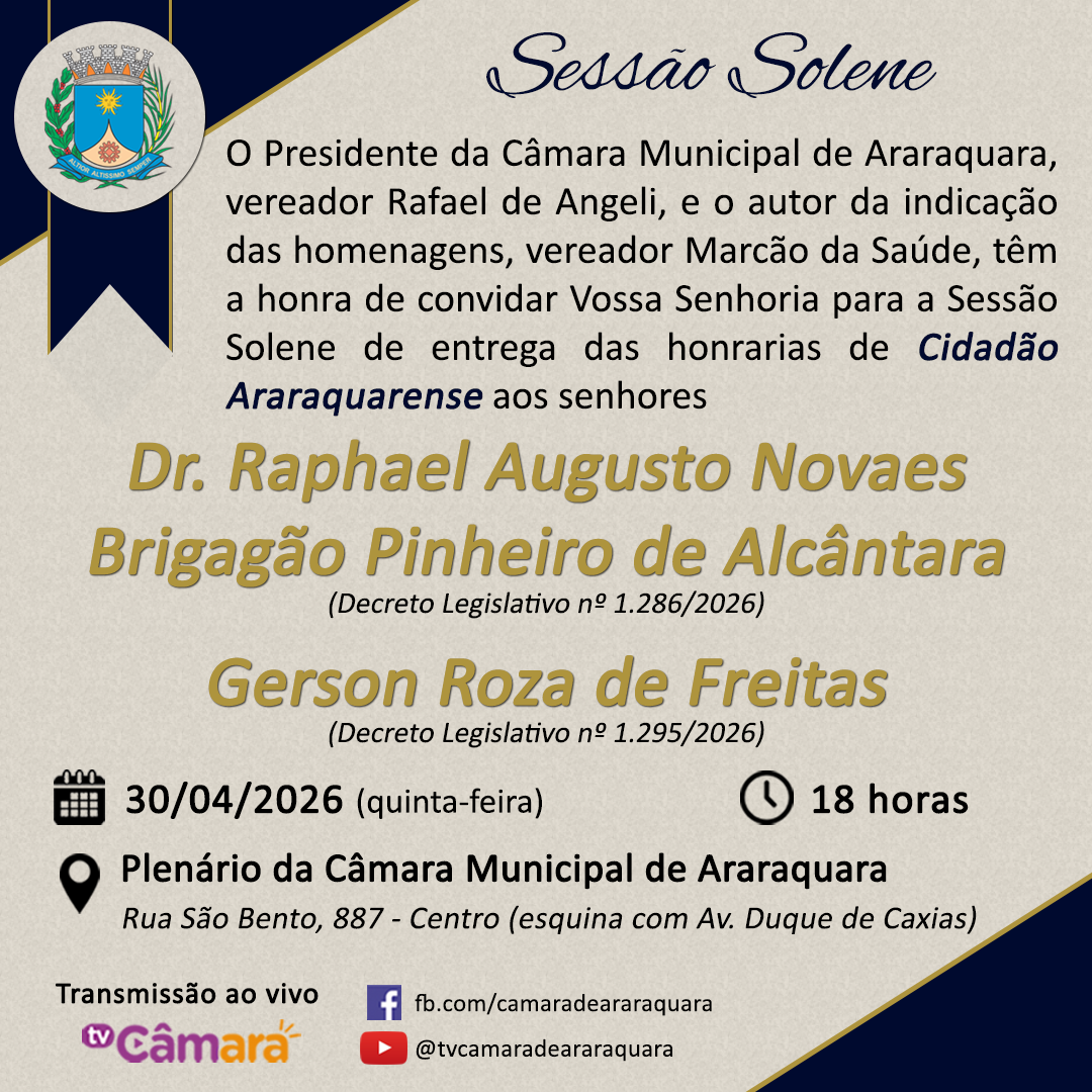 O presidente da Câmara Municipal de Araraquara, vereador Rafael de Angeli, e o autor das homenagens, vereador Marcão da Saúde, têm a honra de convidar Vossa Senhoria para a Sessão Solene de entrega das honrarias de Cidadão Araraquarense ao senhores Dr. Raphael Augusto Novaes Brigagão Pinheiro de Alcântara - conforme Decreto Legislativo nº 1.286/2026, e também ao senhor Gerson Roza de Freitas - conforme Decreto Legislativo nº 1.295/2026.