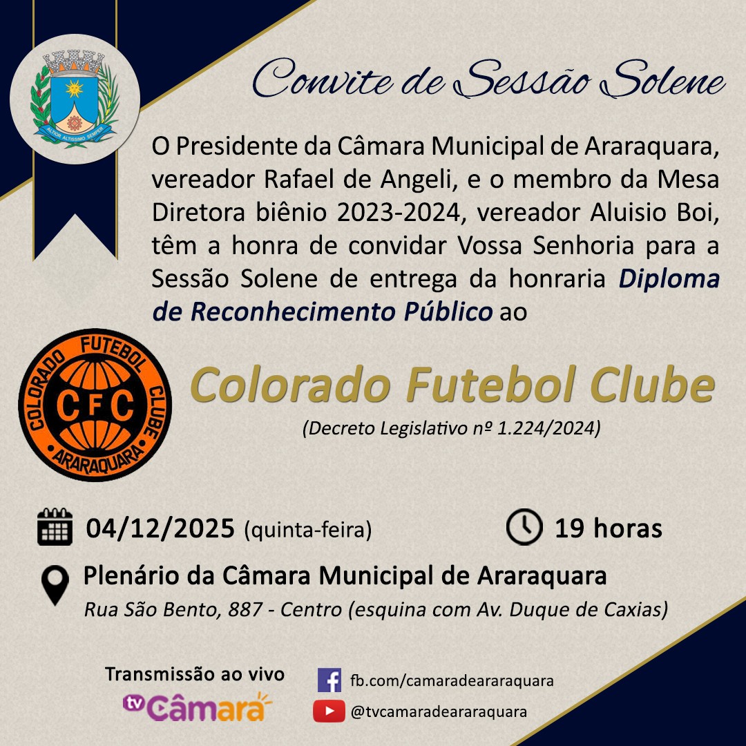O presidente da Câmara Municipal de Araraquara, vereador Rafael de Angeli, e o membro da Mesa Diretora biênio 2023/2024, vereador Aluisio Boi, têm a honra de convidar para a Sessão Solene de entrega do Diploma de Reconhecimento Público ao Colorado Futebol Clube - conforme Decreto Legislativo nº 1.224/2024.