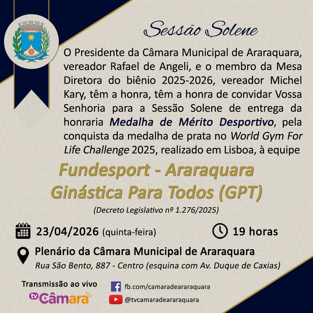 O presidente da Câmara Municipal de Araraquara, vereador Rafael de Angeli, e demais membros da Mesa Diretora do biênio 2025-2026, têm a honra de convidar para a Sessão Solene de entrega da honraria Medalha de Mérito Desportivo à equipe Fundesport - Araraquara Ginástica Para Todos - GPT, pela conquista da medalha de prata no World Gym For Life Challenge 2025, realizado em Lisboa - conforme Decreto Legislativo nº 1.276/2025.