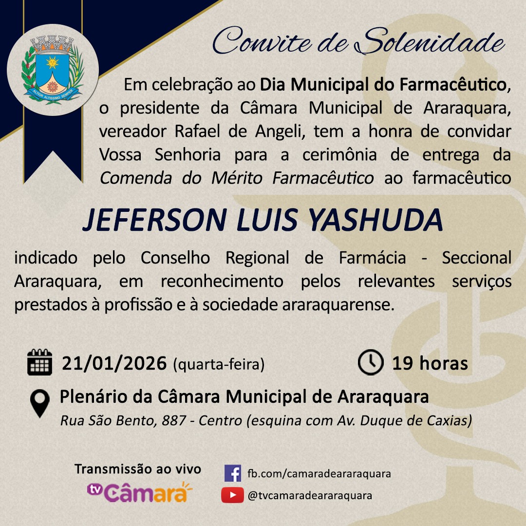 Em celebração ao Dia Municipal do Farmacêutico, a ser comemorado anualmente em 20 de janeiro, o presidente da Câmara Municipal de Araraquara, vereador Rafael de Angeli, tem a honra de convidar para a cerimônia de entrega da Comenda Mérito Farmacêutico 2026.