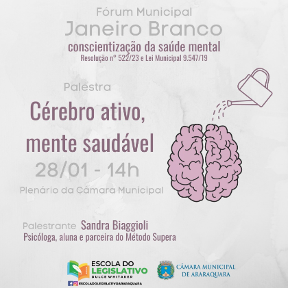 A Escola do Legislativo “Dulce Whitaker” promove na quarta-feira (28), às 14 horas, no Plenário da Câmara, a palestra “Cérebro Ativo, Mente Saudável”, com orientações práticas sobre como manter a mente saudável, ativa e em equilíbrio.