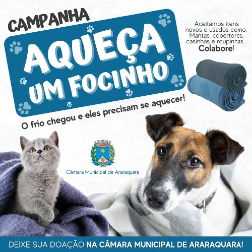 O frio chegou e Araraquara tem muitos animais carentes nas ruas e nos abrigos precisando ser aquecidos. A Comissão Permanente de Desenvolvimento, Ciência, Tecnologia e Urbano Ambiental da Câmara Municipal de Araraquara, realiza até 31 de julho, uma campanha de arrecadação de mantas de microfibra, cobertores, casinhas e roupinhas para proteger os bichinhos do frio.