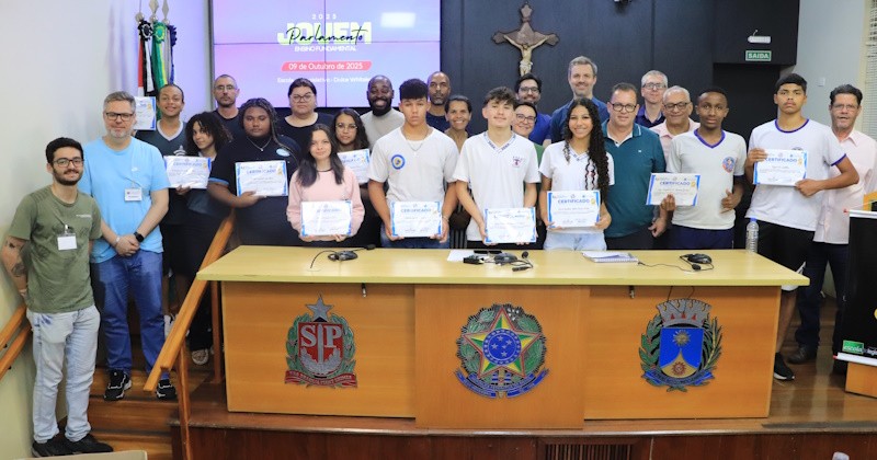 Seis Projetos de Lei e quatro Requerimentos aprovados, além de oito Indicações apresentadas. Este foi o saldo da edição 2025 da Sessão do Parlamento Jovem (PJ) da Escola do Legislativo (EL) “Dulce Whitaker”, realizada na tarde de quinta-feira (9) no Plenário da Câmara de Araraquara – o evento reuniu dezenas de pessoas, entre alunos, professores, autoridades e outros interessados.