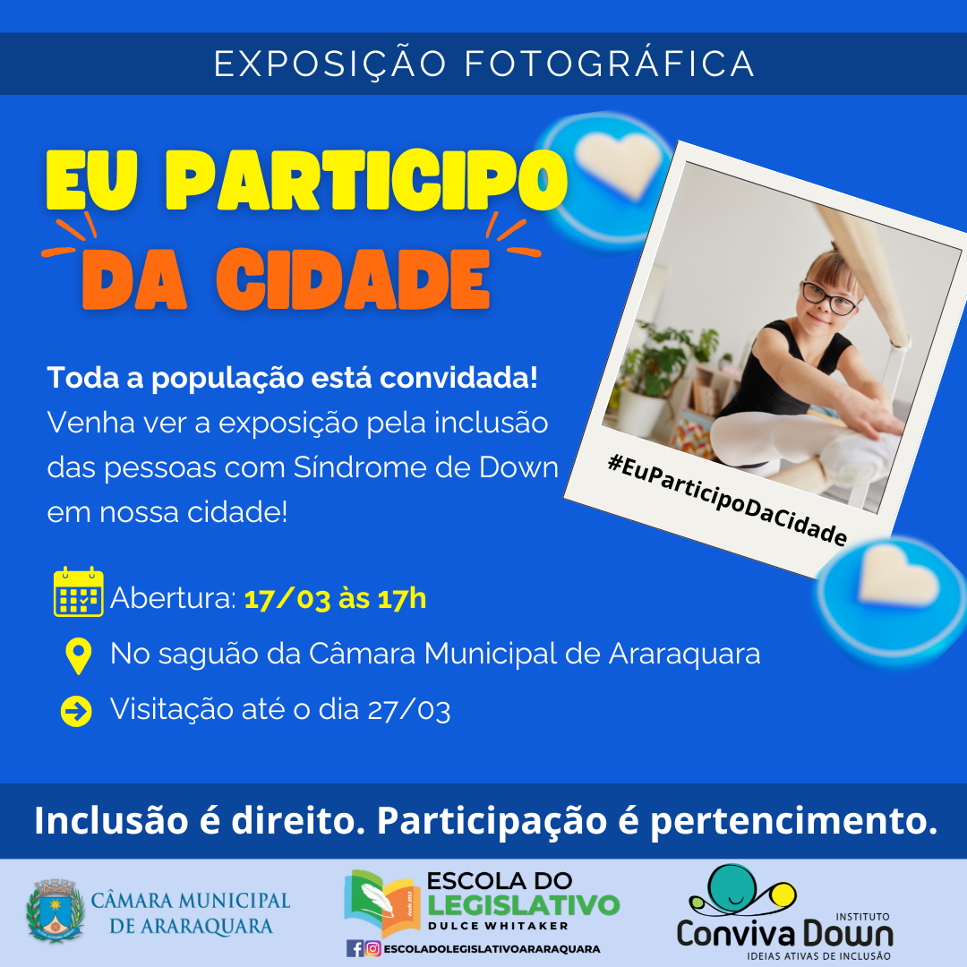 A Escola do Legislativo de Araraquara convida a população para prestigiar a exposição “Eu Participo da Cidade”, que será aberta no dia 17 de março, às 17 horas, no saguão da Câmara Municipal.