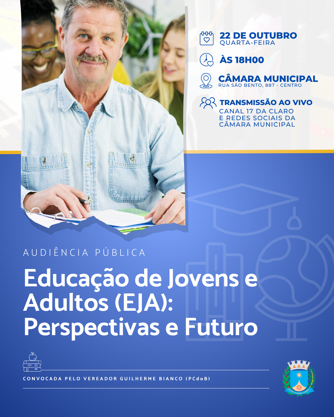 A Câmara Municipal de Araraquara convida para participar da audiência pública para debater o tema “Educação de Jovens e Adultos (EJA) – Perspectivas e Futuro”. Requerida pelo vereador Guilherme Bianco (PCdoB) — requerimento nº 1701/2025 —, a audiência será transmitida ao vivo pela TV Câmara (canal 17 da Claro), pelo Facebook e pelo YouTube.
