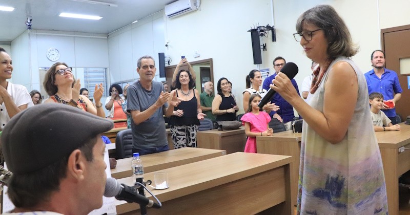 Meire Silva, representante da Deputada Estadual Márcia Lia (PT), parabenizou Maria Bernadete pela trajetória e por todo o trabalho que ela continua desenvolvendo em prol da arte e da cultura. Para a chefe de gabinete, o prêmio contribui para que as histórias da cidade e da Câmara Municipal sejam escritas de forma verdadeira e coletiva.
